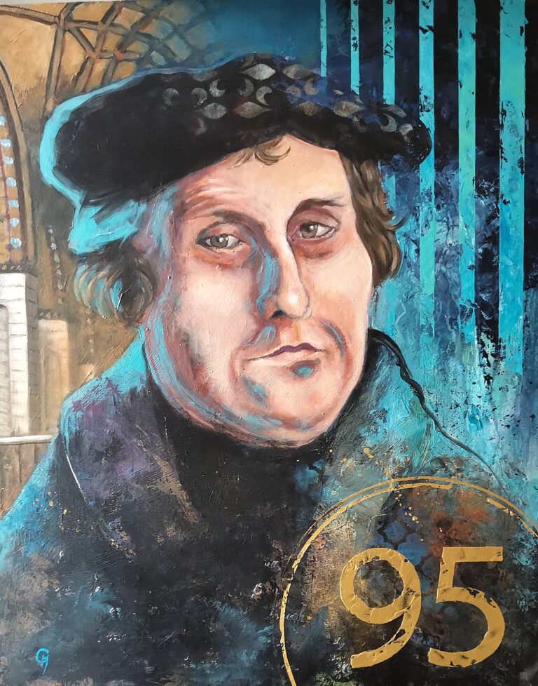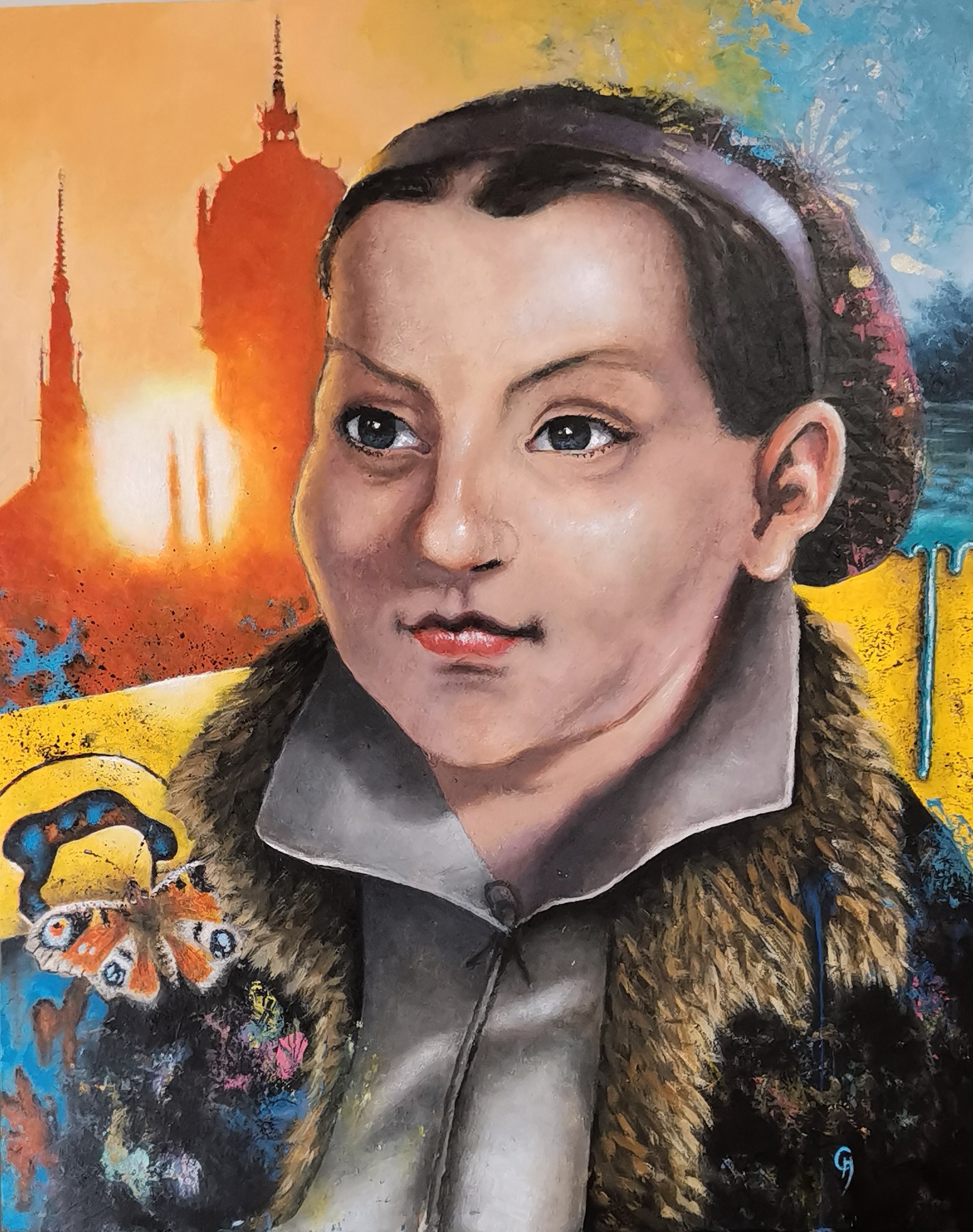 Neben architektonischen Motiven umfasst der Werkkomplex auch Porträts historischer Figuren. Sie erscheinen nicht als klassische Bildnisse, sondern als Teil des gleichen Bildraums, in dem Geschichte, Symbolik und Gegenwart miteinander verschränkt sind.